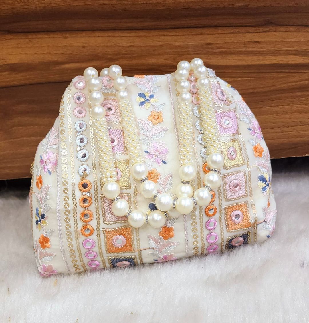Designer Mulitcolor Embroidery Silk Handcrafted Potli in Cream color-81649