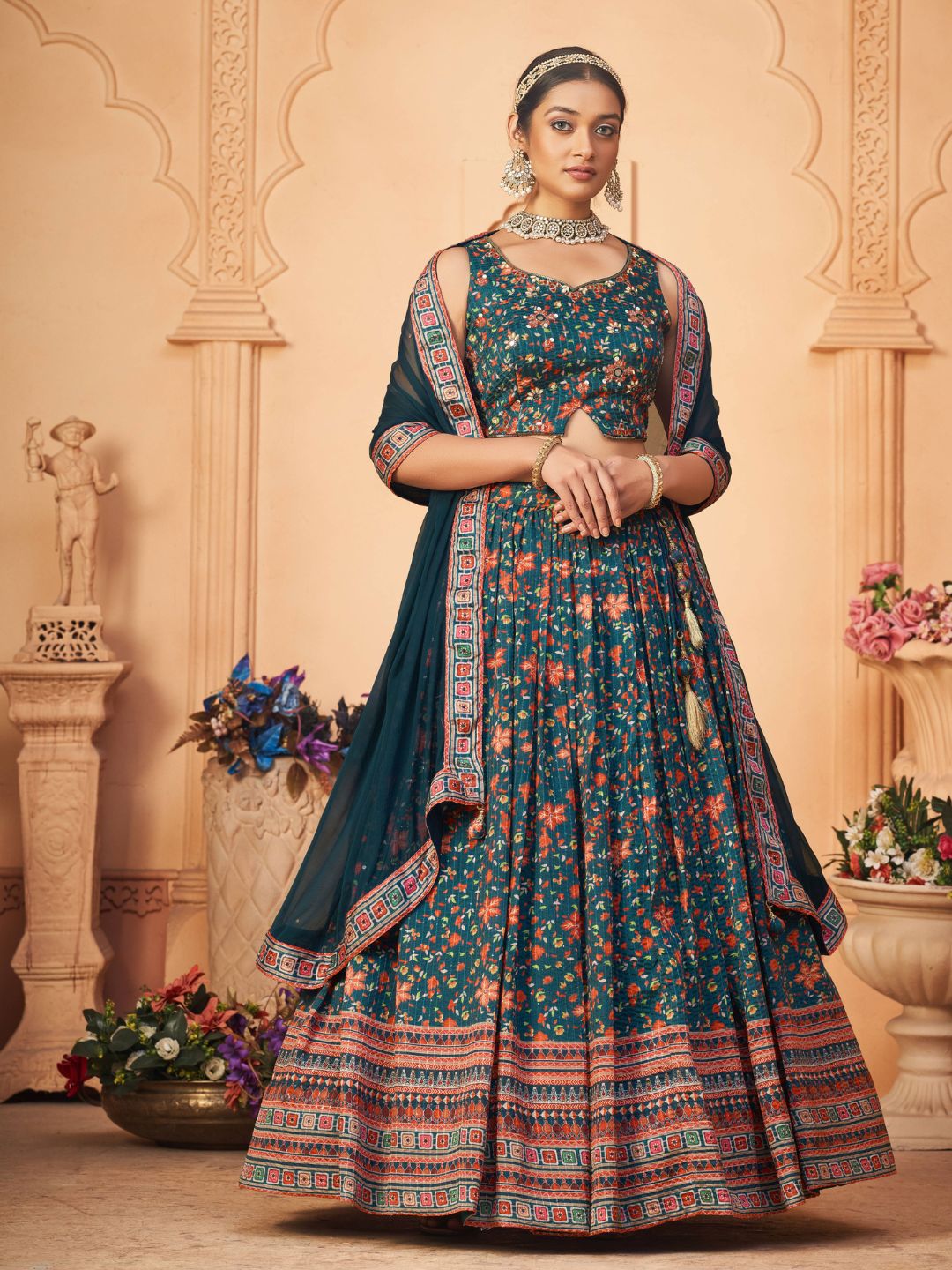 Digital Printed Chinnon Lehenga in Navy Blue