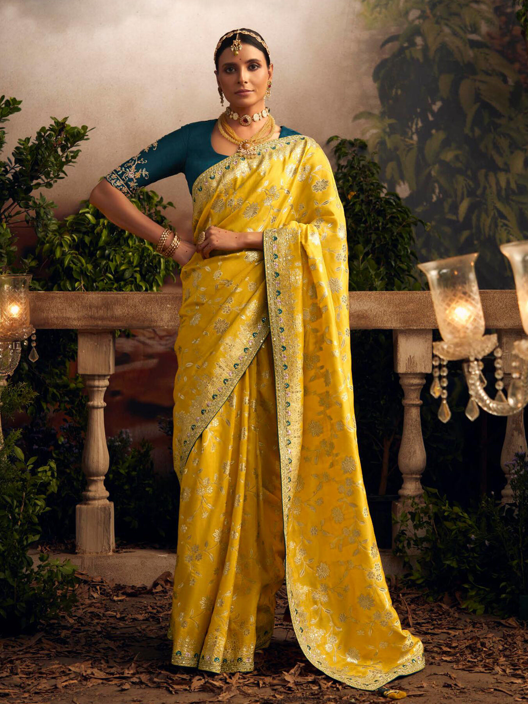 Embroidered Pure Viscose Dola Silk Traditional Bridal Saree In Yellow Color-81674
