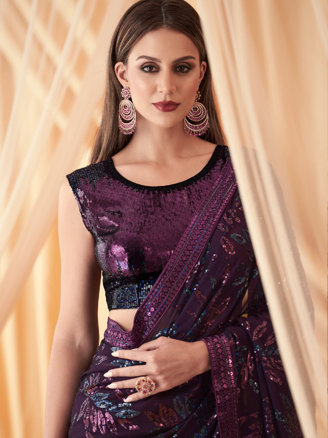 Embroidered Shimmer Georgette Silk Partywear Traditional Saree In Purple Color-81521