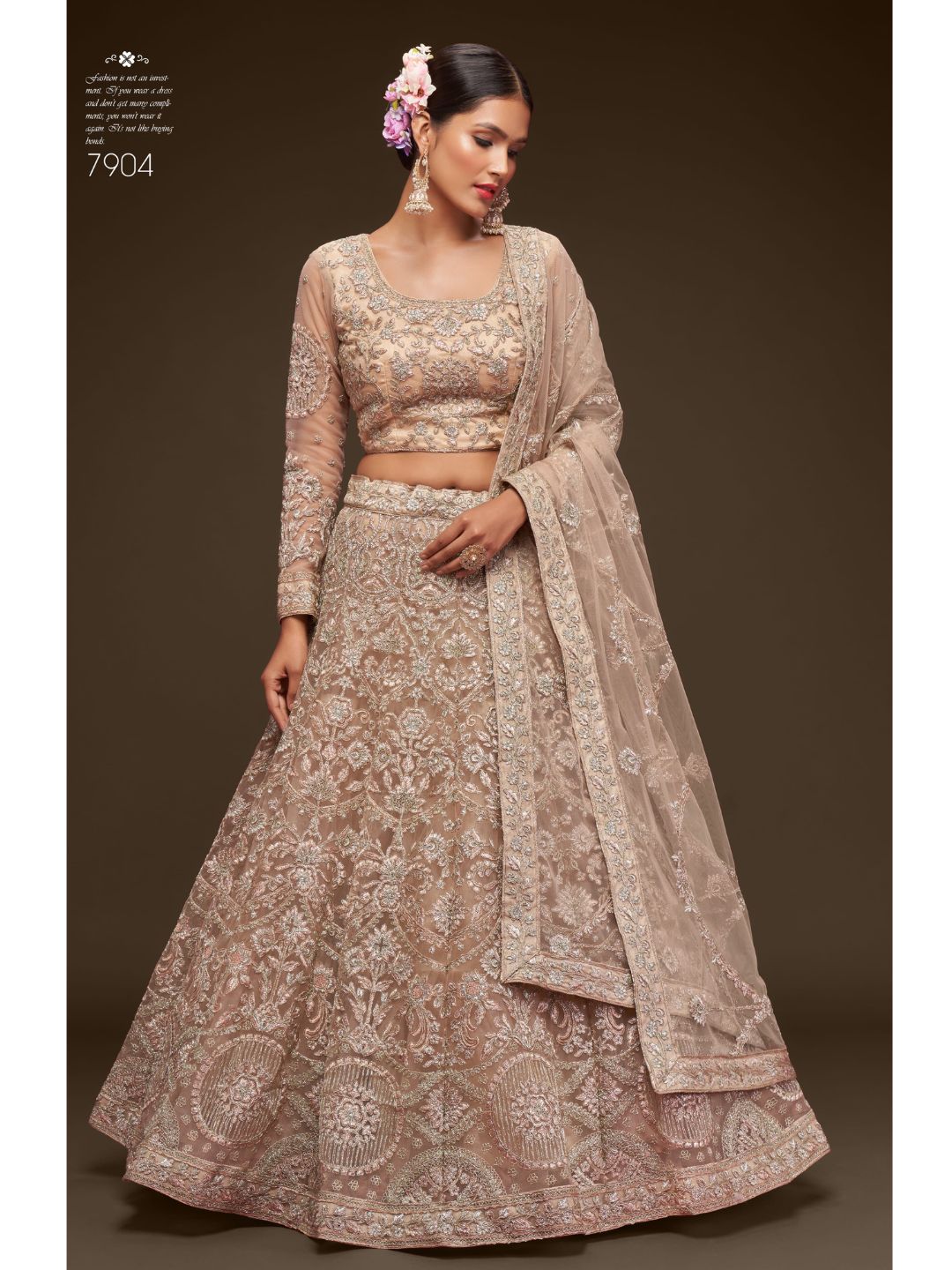 Net Wedding Lehenga in Beige and Brown with Zari work