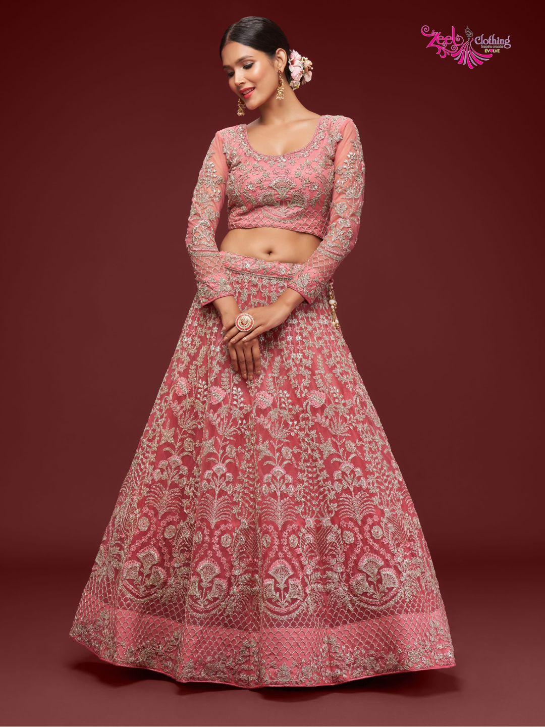 Net Wedding Lehenga in Pink and Magenta with Zari work