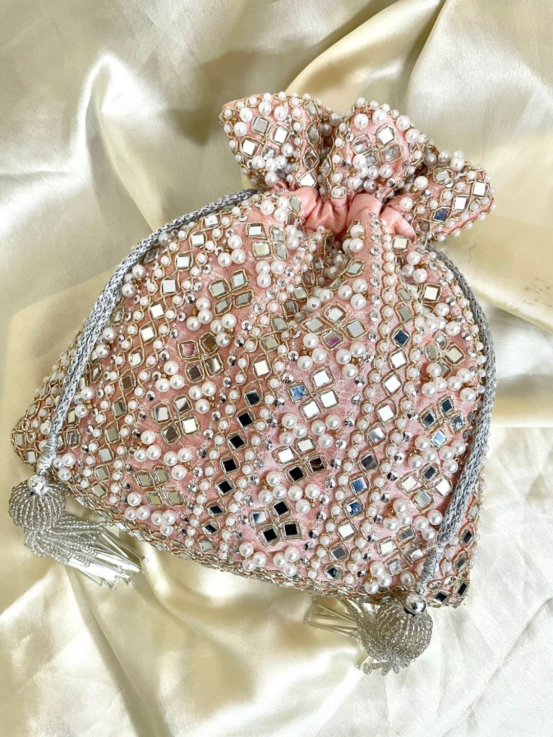 Featuring an Designer Heavy Mirror Double Side Embroidered Handcrafted Potli