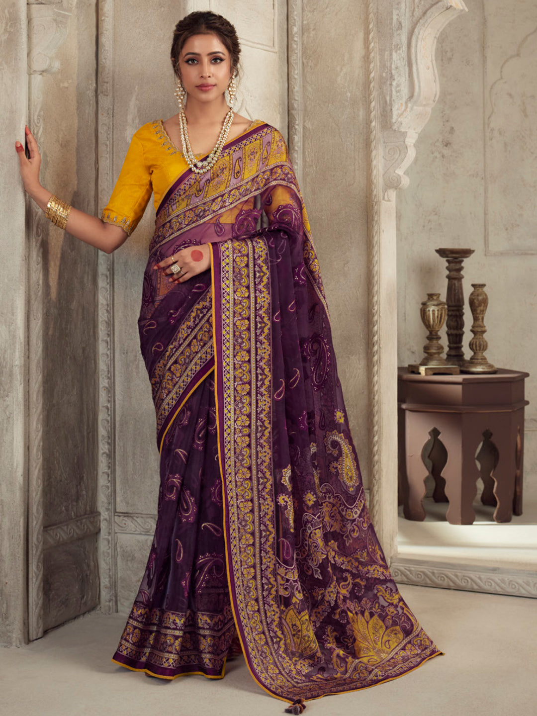 Printed Organza Silk Partywear Sangeet Saree In Purple Color-81566