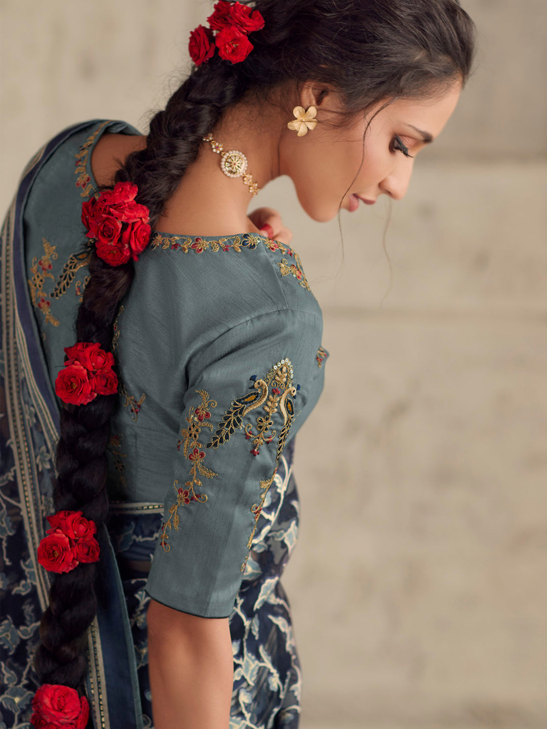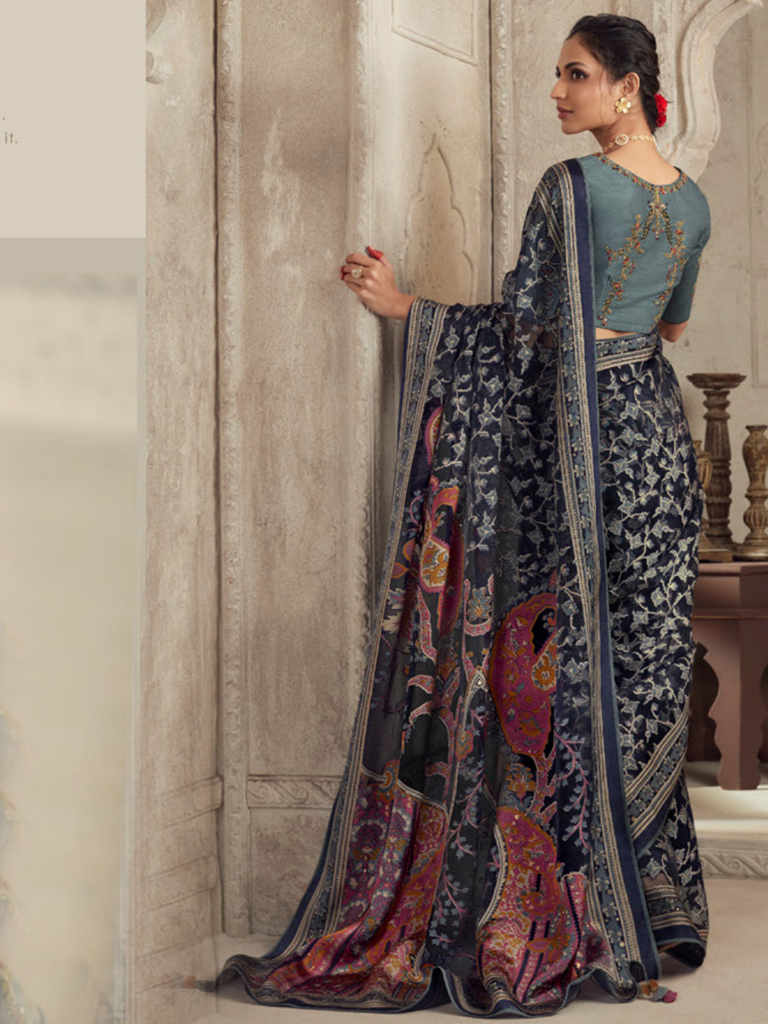 Printed Organza Silk Partywear Sangeet Saree In Grey Color-81571