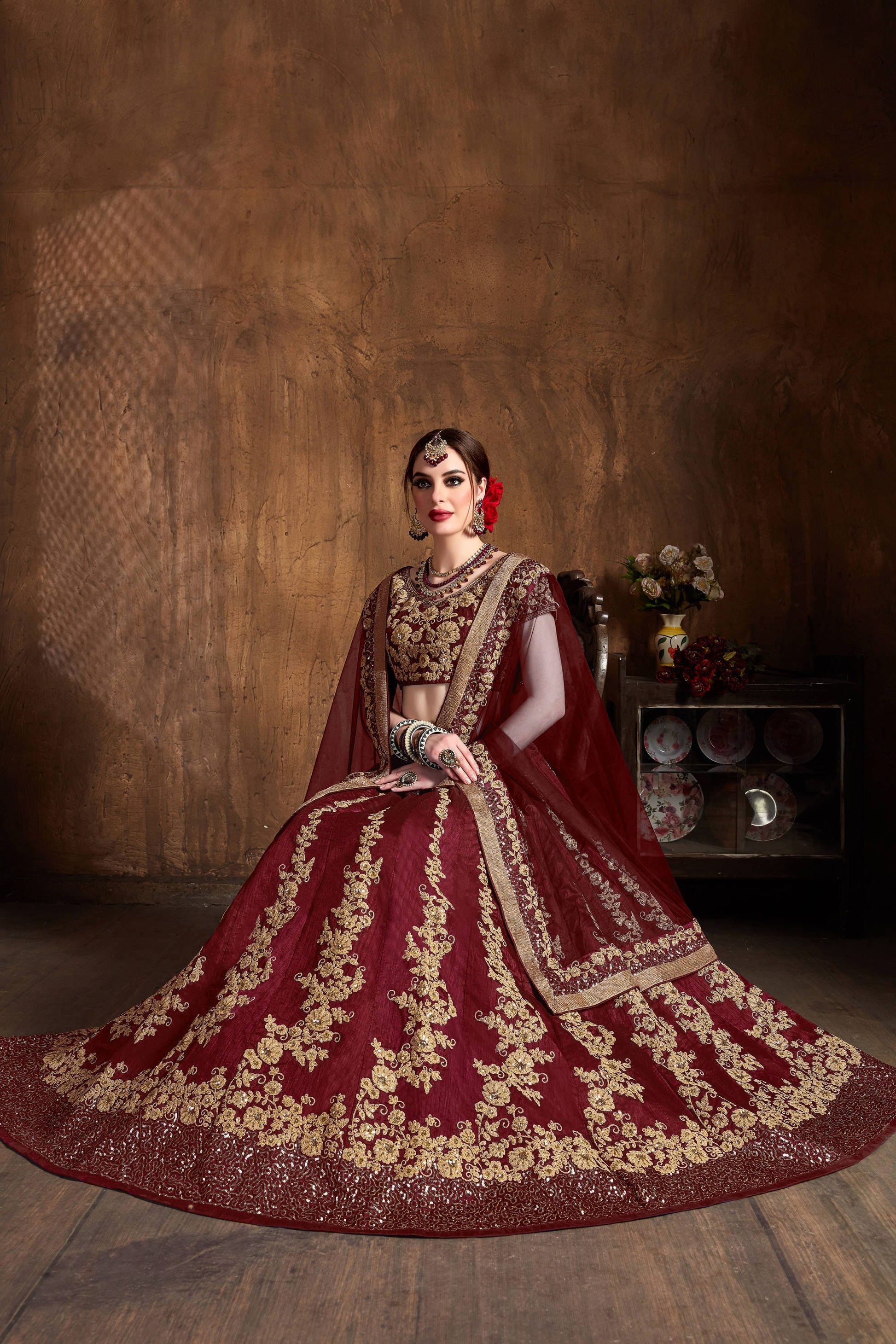 Raw Silk Engagement Sangeet Lehenga with Embroidered work in Maroon color-82108