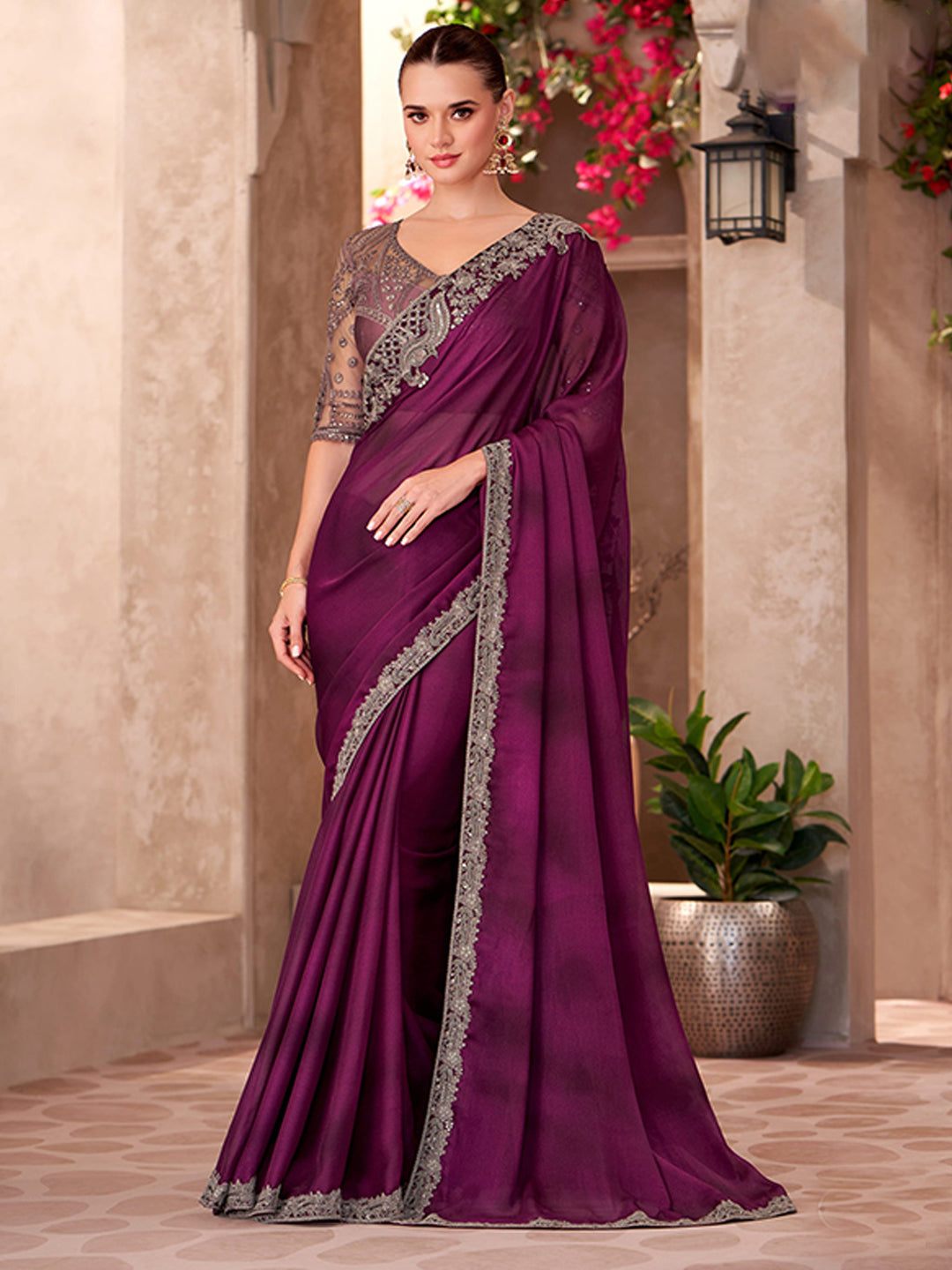 Sparkle shaded Chiffon With Sartin Work Wedding Saree in Purple color-41047