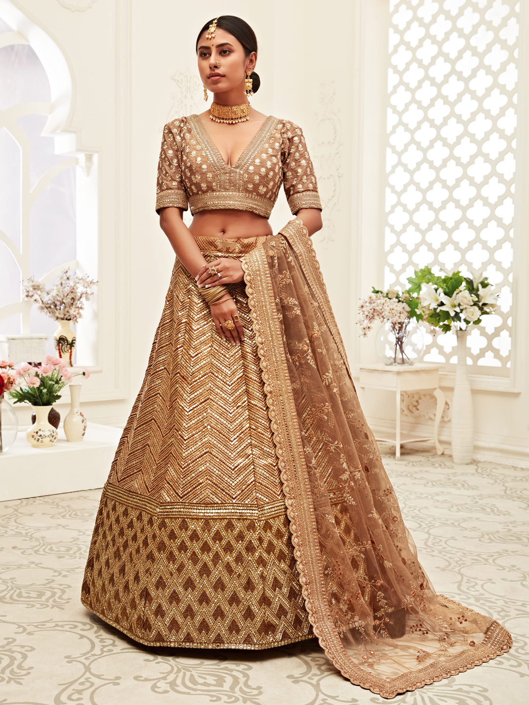 Silk Bridal Lehenga with Embroidered work in Brown color-82121