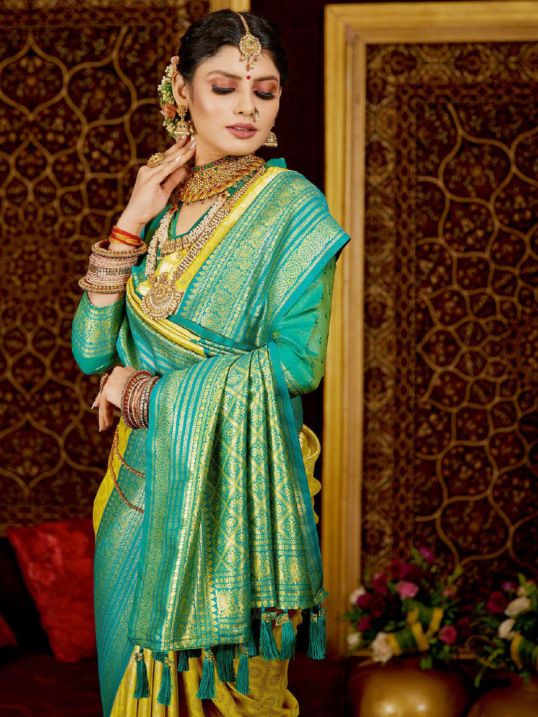 Weaving Pure Kanjivaram Soft Silk Rich Pallu Traditional Saree In Yellow Color-81369